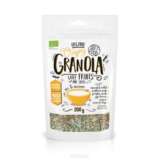 Diet-Food Granole is a great breakfast product, pour it with your favorite milk, yoghurt or any fruit juice, but you can eat it directly from the package as a snack.