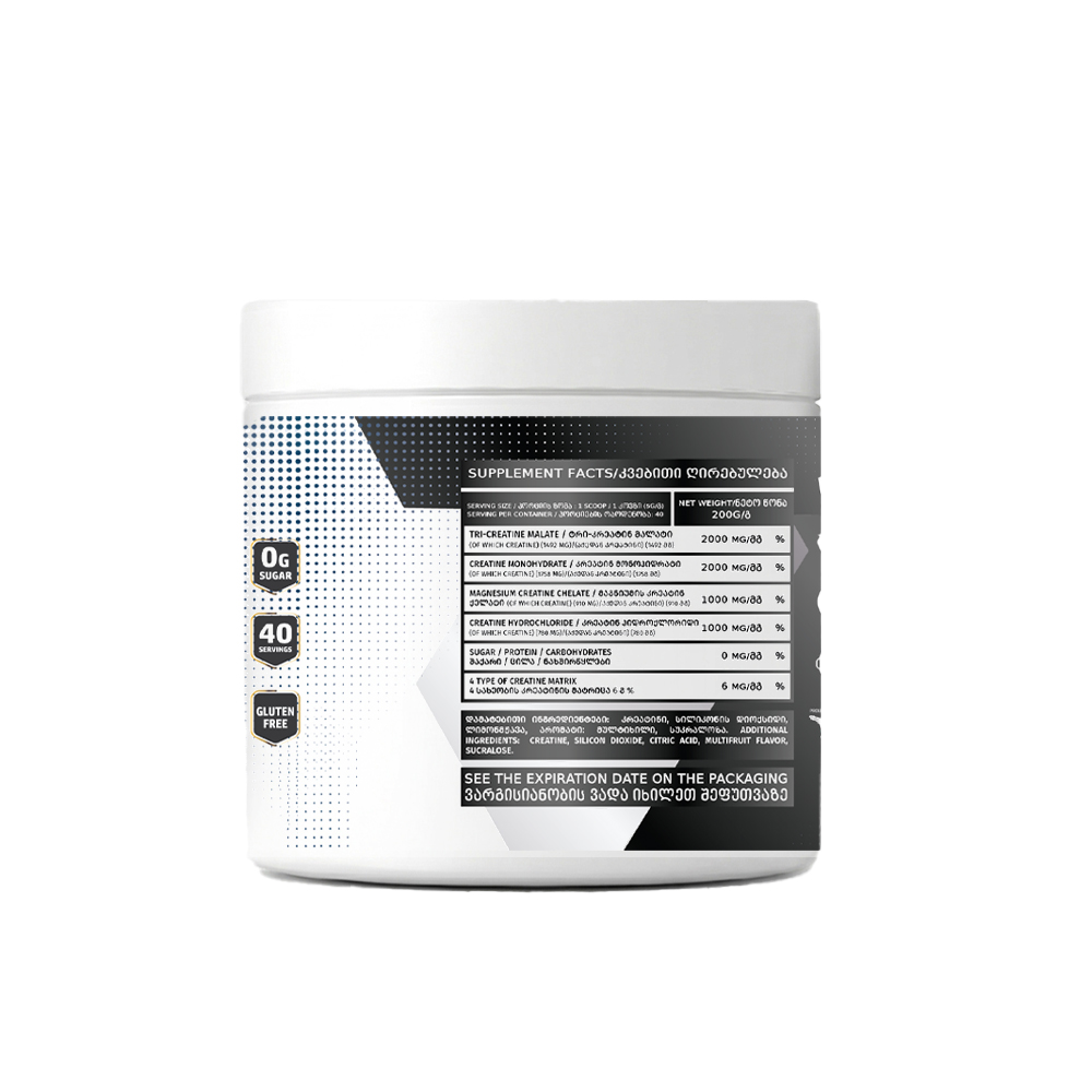 Tri-Creatine Malate – Malate is an acid involved in aerobic energy production. "Tri-creatine" means three creatine molecules bonded to one malate molecule. This form stands out for its excellent solubility and high absorption rate. Studies confirm its outstanding performance benefits among all creatine types.