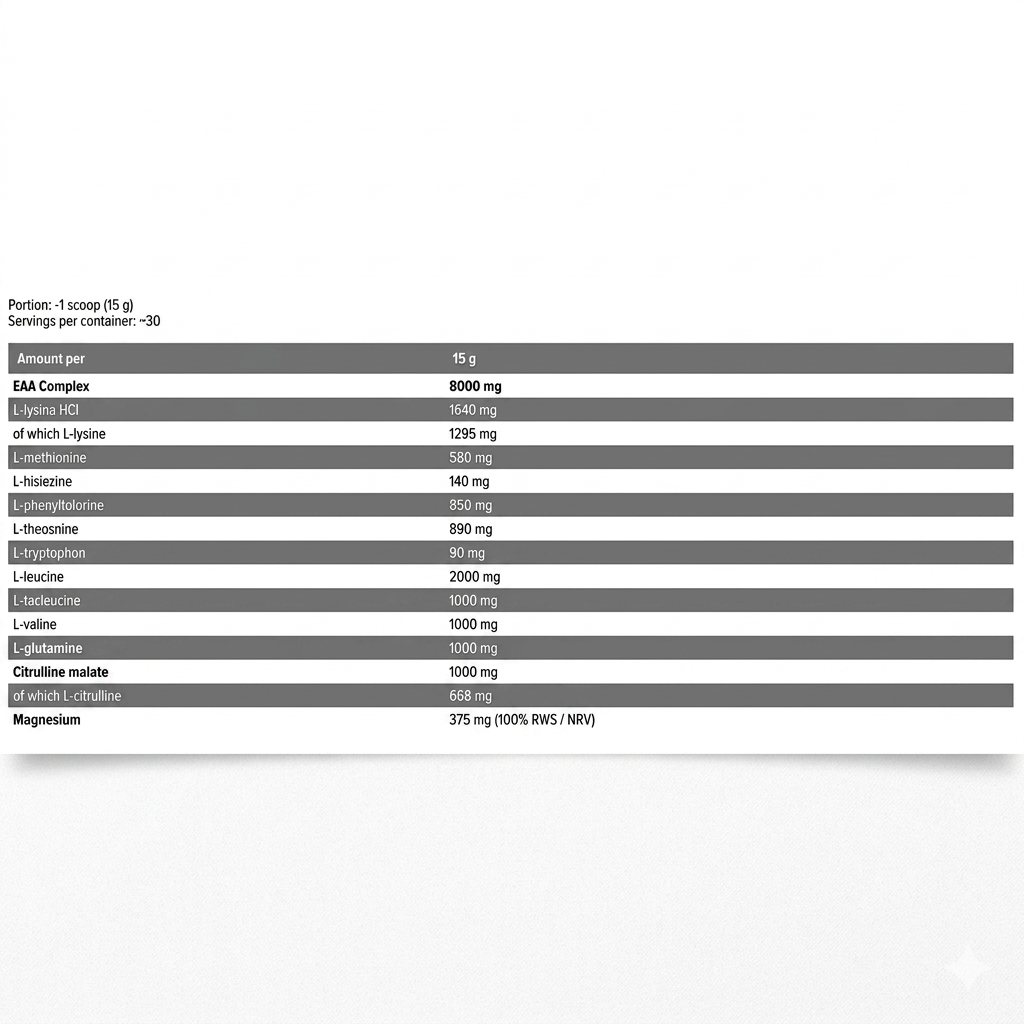 ეს კომპლექსი გამოირჩევა იმით, რომ ერთ პორციაში აერთიანებს 8000მგ შეუცვლელ ამინომჟავებს (EAA), მათ შორის BCAA-ს, გლუტამინსა და ციტრულინს, რაც ვარჯიშის პროცესს უფრო პროდუქტიულს ხდის.