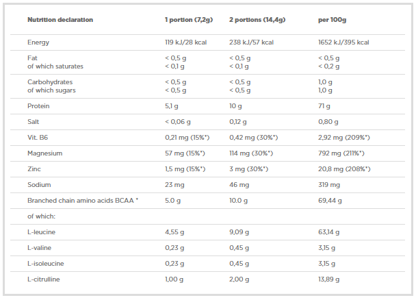 Bcaa 20:1:1 xplode – სრულყოფილი ფორმულა- კომპლექსური მოქმედება- გემრიელი არომატი- მაქსიმალური შედეგი. საუკეთესო კომბინაცია ბაზარზე- 5000 მგ უმაღლესი ხარისხის BCAA ერთ სერვინგზე, გამდიდრებულია L-citrulline-ის მაღალი შემცველობით და მინერალებით: მაგნიუმი, სოდიუმი, თუთია, ვიტამინ B6.ორგანიზმში დაუყოვნებლივ ხდება BCAA Xplode-ის ათვისება. BCAA Xplode კუნთების საშენ მასალას წარმოადგენს, ისინი დაუყოვნებლივ აღწევენ დანიშნულების ადგილზე, რადგან შეიწოვება სისხლში, განსხვავაებით ცილოვანი საკვებდანამატებისგან . BCAA Xplode™ 20:1:1 -ს დამატებული აქვს ციტრულინის სათანადო რაოდენობა, რაც ეხმარება კუნთის ფამფინგს.უზრუნველყოფს მოტივაციას და გამძლეობას რთული წვრთნების დროსაც. პროდუქტი განკუთვნილია მოზრდილებისთვის, ვისაც სურს მიიღოს საკვებდანამატის სახით BCAA (L-leucine, L-valine, L-isoleucine), L-citrulline, magnesium, zinc and vitamin B6.