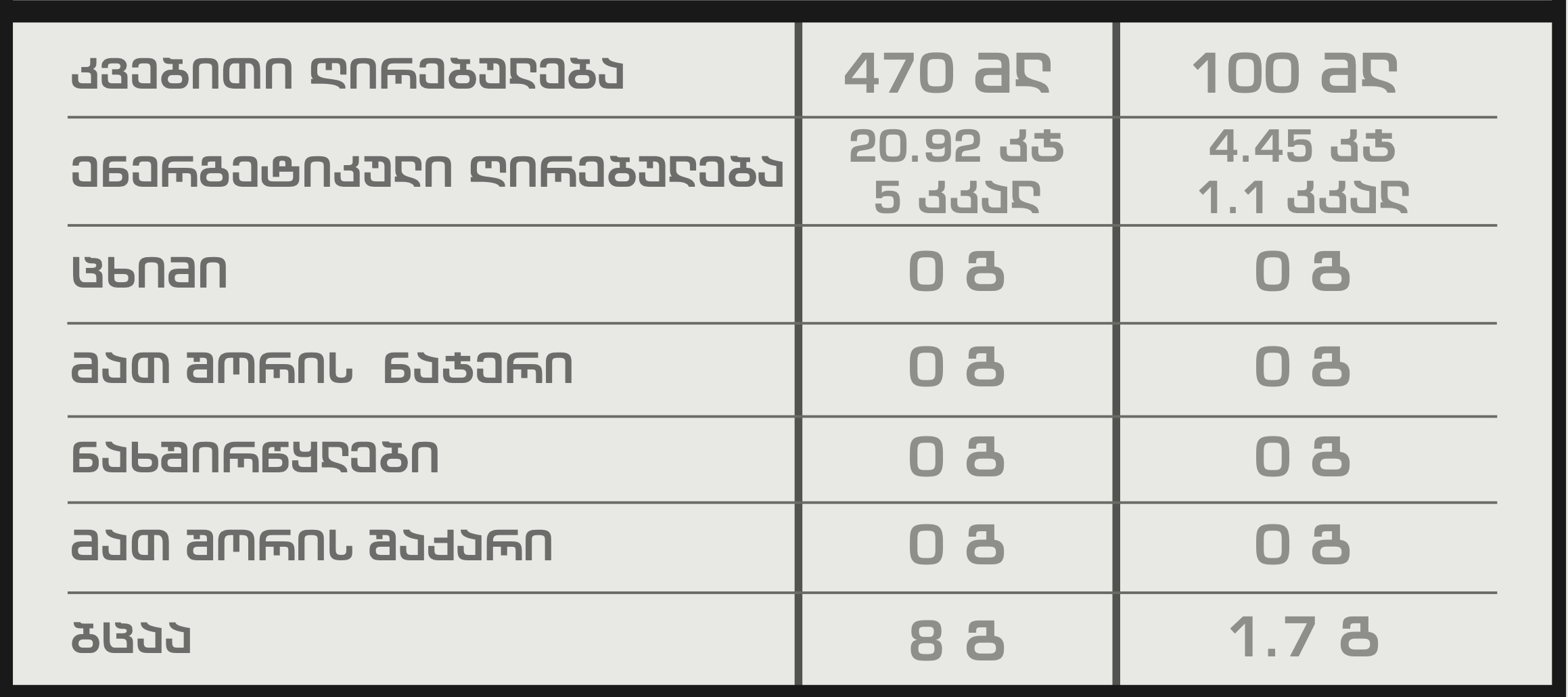 - არ შეიცავს შაქარს, ნახშირწყალსა და კალორიებს
