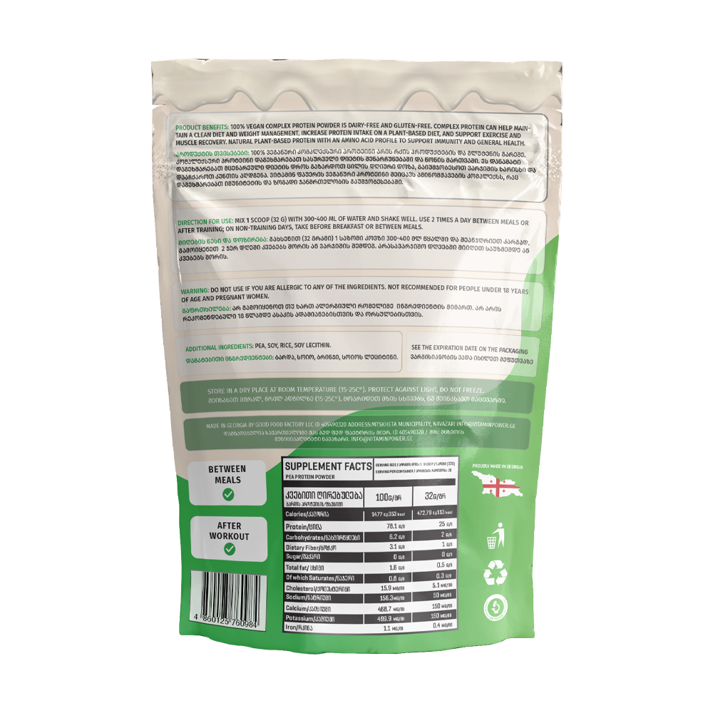 Vitamin Power Vegan Protein Complex არის მცენარეულ ცილებზე დაფუძნებული პრემიუმ ფორმულა, რომელიც გამიზნულია ყველასთვის, ვისაც სურს მიიღოს მაღალი ხარისხის ცილა ცხოველური წყაროების გარეშე. პროდუქტი იდეალურია ვეგანებისთვის, ვეგეტარიანელებისთვის და მათთვის, ვისაც ლაქტოზასთან ან რძის პროტეინებთან დისკომფორტი აქვს. ყოველი პორცია უზრუნველყოფს 24.8 გ ცილას, რაც ხელს უწყობს კუნთოვანი მასის შენარჩუნებასა და აღდგენას ვარჯიშის შემდეგ და ამავე დროს აკმაყოფილებს ორგანიზმის სრულფასოვან ამინომჟავურ საჭიროებებს.