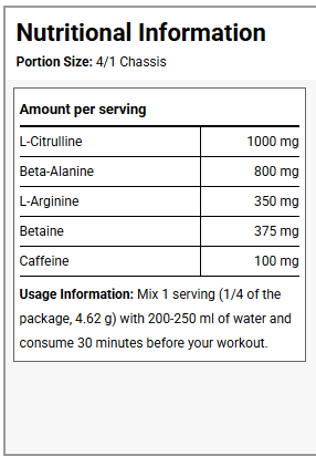 Формула включает мощные дозировки цитруллина, бета-аланина и аргинина, которые обеспечивают максимальный пампинг, улучшают кровообращение и позволяют тренироваться на пределе возможностей.