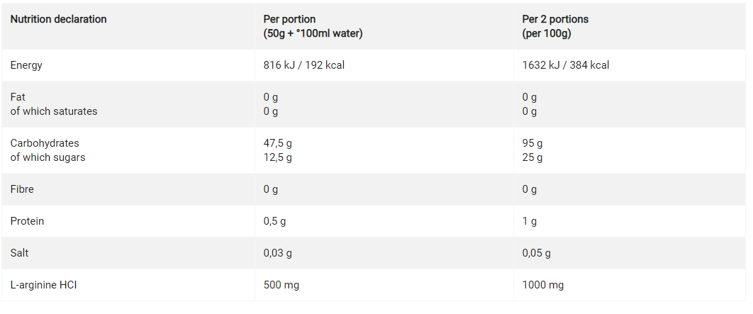 მიღების წესი და დოზირება მიიღეთ 2-4 პორცია დღეში, პორციების რაოდენობა დამოკიდებულია ვარჯიშის სიხშირეზე/ინტენსივობაზე და სხეულის წონაზე.გახსენით ერთი პორცია (50გრ) 100 მლ წყალში და მიიღეთ ვარჯიშამდე და ვარჯიშის შედმეგ გაფრთხილება თუ ხართ 18 წლამდე ასაკის, ორსული ან გაქვთ ლაქტაციის პერიოდი, თუ რაიმე სამედიცინო მდგომარეობის დიაგნოზი გაქვთ ან იყენებთ მედიკამენტებს, არ გამოიყენოთ ექიმთან კონსულტაციის გარეშე. არ გადააჭარბოთ რეკომენდებულ დოზას. საკვებდანამატები უნდა იყოს ჯანსაღი მრავალფეროვანი დიეტის ნაწილი.