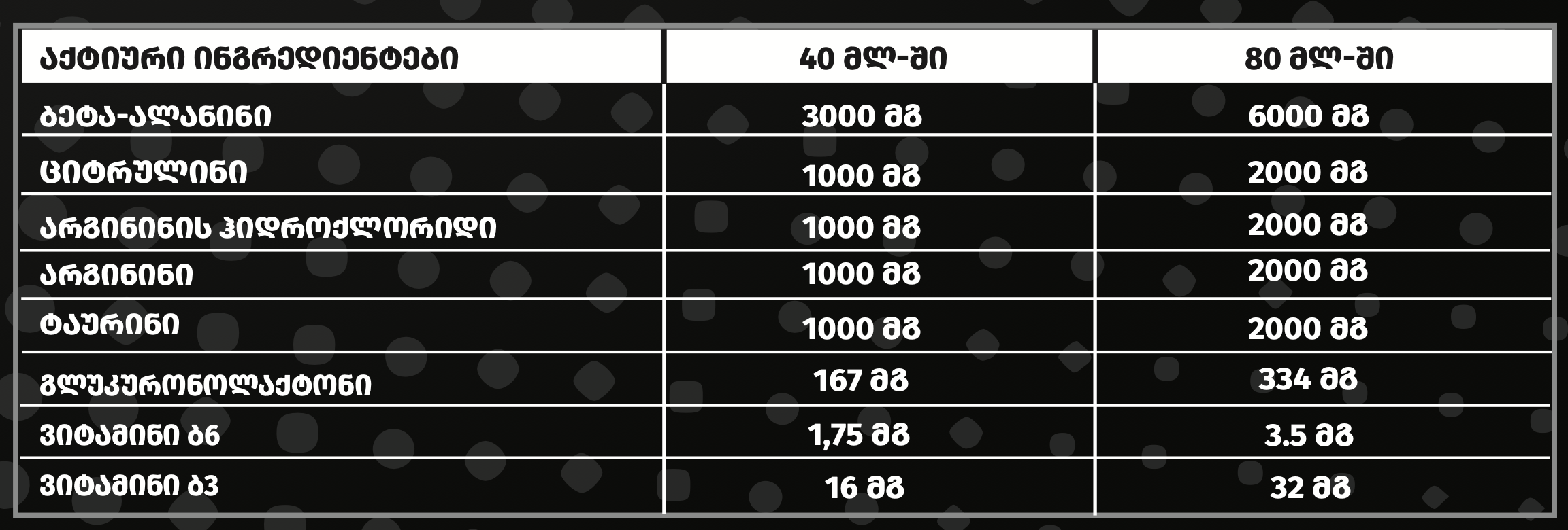 Продукт представлен в жидкой форме и содержит 2 порции в одном шоте. Одна порция (40 мл) содержит высокоэффективные дозировки активных веществ: