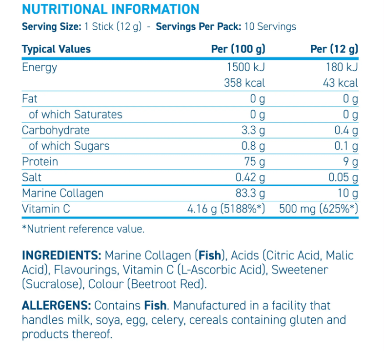 Each serving contains 12 g of hydrolyzed marine collagen