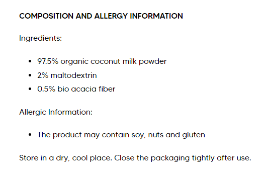 Bio Coconut Drink in powder is a 100% natural and organic product without artficial flavourings, fillers, preservatives or other unhealthy substances.