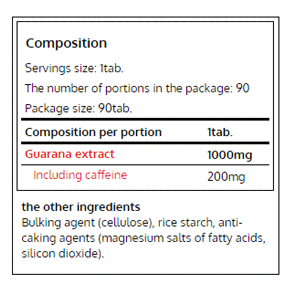 Each tablet provides 1000 mg of guarana extract, including 200 mg of caffeine. This amount is optimal for effective stimulation, improving psychophysical endurance, enhancing concentration, and reducing fatigue.