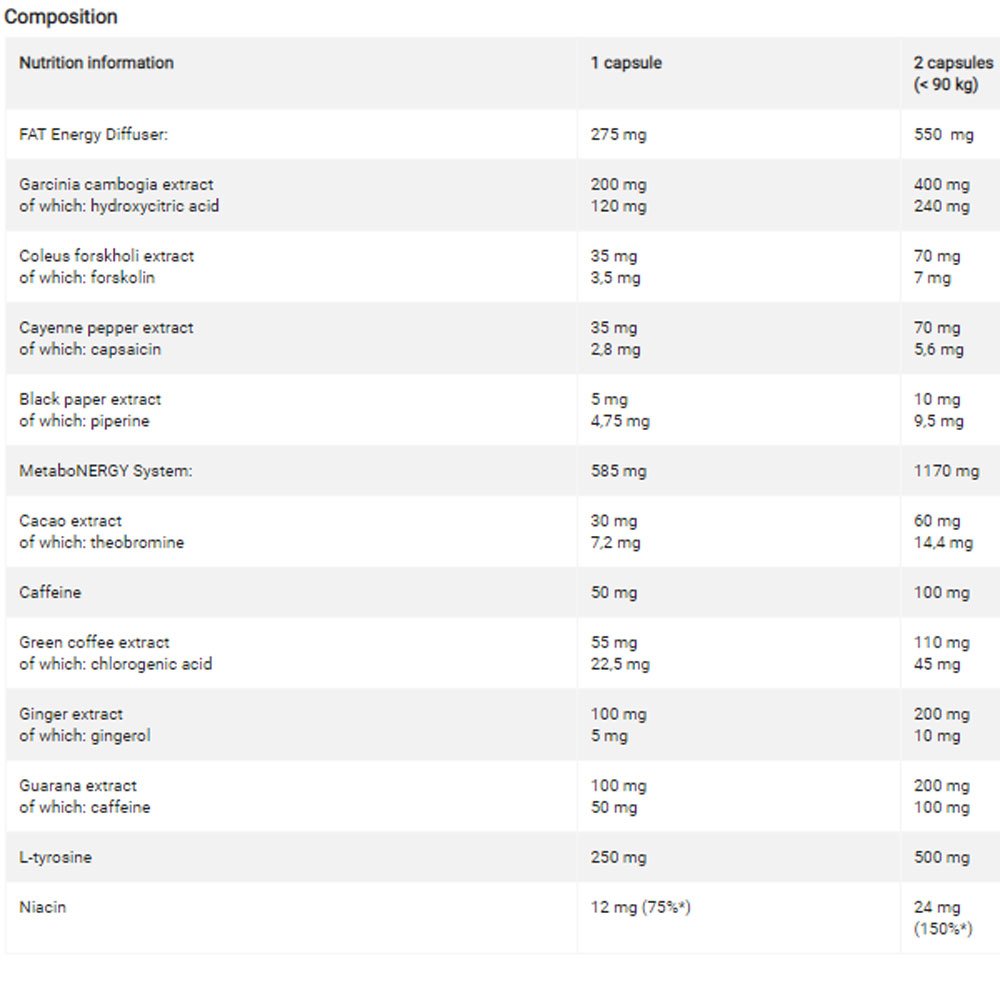 Olimp Thermo Speed is a scientifically developed composition of the most active nutrients that stimulate thermogenesis: guarana extract, tyrosine, caffeine, green tea extract. In addition, bitter orange extract significantly contributes to fat reduction and supports the development of lean muscle mass. The product is intended for physically active adults, athletes, and any adult who wants to lose weight.