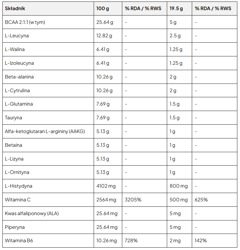 What do you gain by using this product? Among other things, faster post-workout muscle recovery. In addition, protection of already developed muscle tissue from degradation. The product also provides muscle endurance and an additional anabolic impulse. Furthermore, it helps the nervous and immune systems function better. The entire composition is based on active, and most importantly, pharmaceutically pure amino acids at the highest dose, which is safe and extremely beneficial for the body.