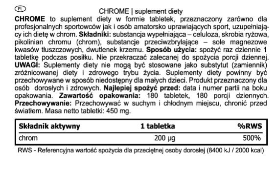 Real Pharm - Chromeis a dietary supplement enriching the diet of active people with the necessary trace mineral - chromium. Real Pharm - Chrome contains a solid dose of chromium, thanks to which people who are actively training and not only can effectively supplement their deficiencies and get the maximum benefits from its beneficial effects.