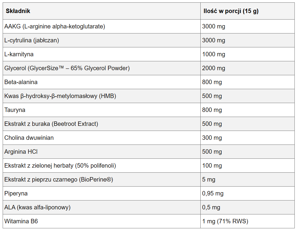 Mix 1 serving (15 g - 1 scoop) with 250 ml of water. Consume 30 minutes before training. Do not exceed the recommended dose (once per day).
