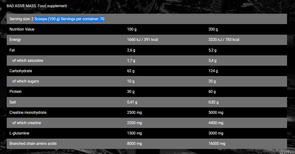 BAD ASS MASS გეინერი არის პროდუქტი, რომელიც ამდიდრებს ორგანიზმს ცილების და ნახშირწყლების კომპლექსით, დამატებული კრეატინ მონოჰიდრატის და L-გლუტამინის ოპტიმალურად განსაზღვრული პორციებით. შემოთავაზებული ფორმულა სასარგებლოა, კუნთოვანი მასის მშენებლობისა და მოდელირების დროს. პროდუქტი დამზადებულია ადვილად ხსნადი ფხვნილის სახით, რაც შესაძლებელს ხდის მოამზადოს გემრიელი შეიკი წარმოუდგენელი გემოთი. დანამატი რეკომენდირებულია იმ ადამიანებისთვის, რომლებიც ეძებენ დამატებით კალორიებისა და აუცილებელი საკვები ნივთიერებების წყაროს - პრეპარატი რეკომენდებულია ძალის და გამძლეობის სპორტის მოყვარულთა და პროფესიონალთათვის.