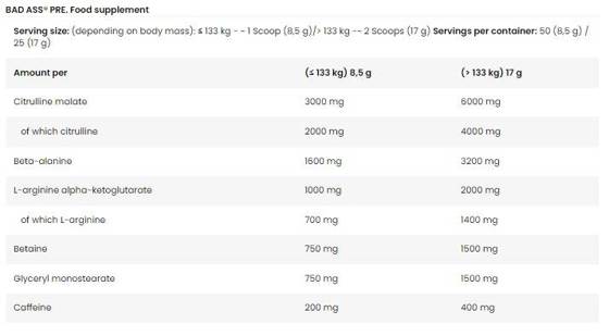Bad Ass Pre - არის ვარჯიშისწინა დანამატი, რომელიც შედგება 6 აქტიური ნაერთებისგან. პროდუქტი დაფუძნებულია ძირითად და მაღალეფექტურ ინგრედიენტებზე.