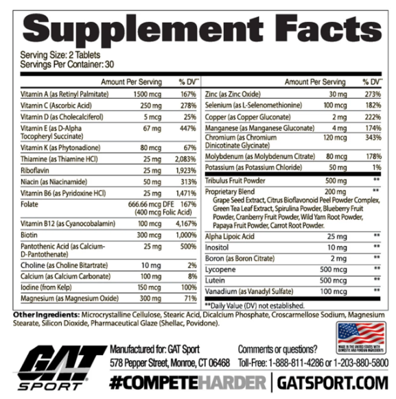 პროდუქტი შეიცავს ყველაზე მნიშვნელოვანი ვიტამინების სრულ კომბინაციას (A, B, C, D, E, K). ასევე ლუტეინს, ანტიოქსიდანტს, რომელიც ხელს უწყობს კუნთოვანი უჯრედების სტიმულაციას, როდესაც დაღლილობა დაგეწყებათ. და ასევე BetTribulus Fruit Powder-ს, რომელიც ბევრი ბოდიბილდერისა და სპორტსმენის მიერ არის რჩეული, ტესტოსტერონის დონის ბუნებრივად გასაზრდელად, რაც თავის მხრივ ხელს უწყობს სპორტული მაჩვენებლების, კუნთოვანი მასის, კუნთების ძალის, ენერგიის დონის და სხვა მრავალი რამის გაუმჯობესებას.