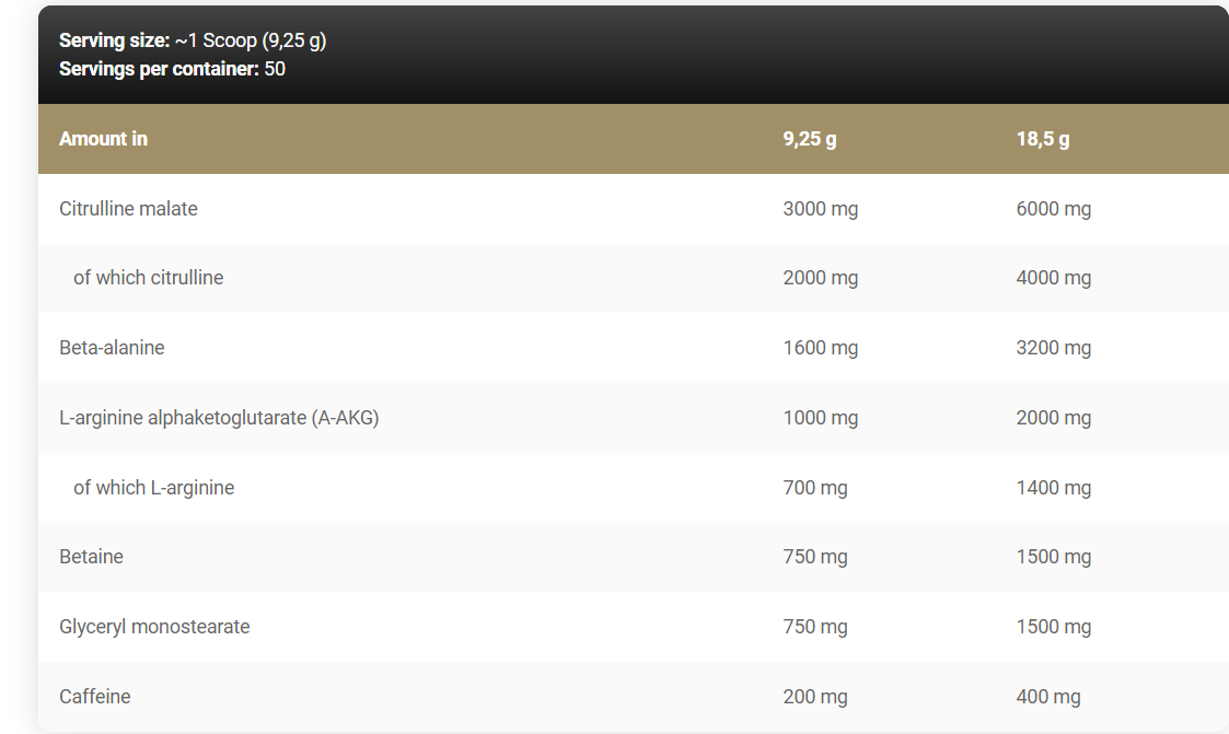 - Citruline malate - არის ამინომჟავა, რომელიც ზრდის აზოტის ოქსიდის გამომუშავებას და გამოყოფას სისხლში. იგი იწვევს კუნთების „ტუმბოს ეფექტს“ (ფამფი), რომელიც განაპირობებს კუნთში უფრო დიდი რაოდენობით საკვები ნივთიერებების და ჟანგბადის შეტანას და მის ეფექტურ ზრდას. ეს ამინომჟავა ახდენს ორგანიზმიდან ტოქსიკური ამიაკის მოცილებას. ციტრულინი ორგანიზმში მოხვედრისას თირკმელებში გარდაიქმნება ამინომჟავა ლ-არგინინად, რომელსაც აქვს მაღალი ბიოათვისებადობა. ამიტომ საუკეთესო შედეგისთვის ეს 2 ამინომჟავა გამოიყენება ერთდროულად.