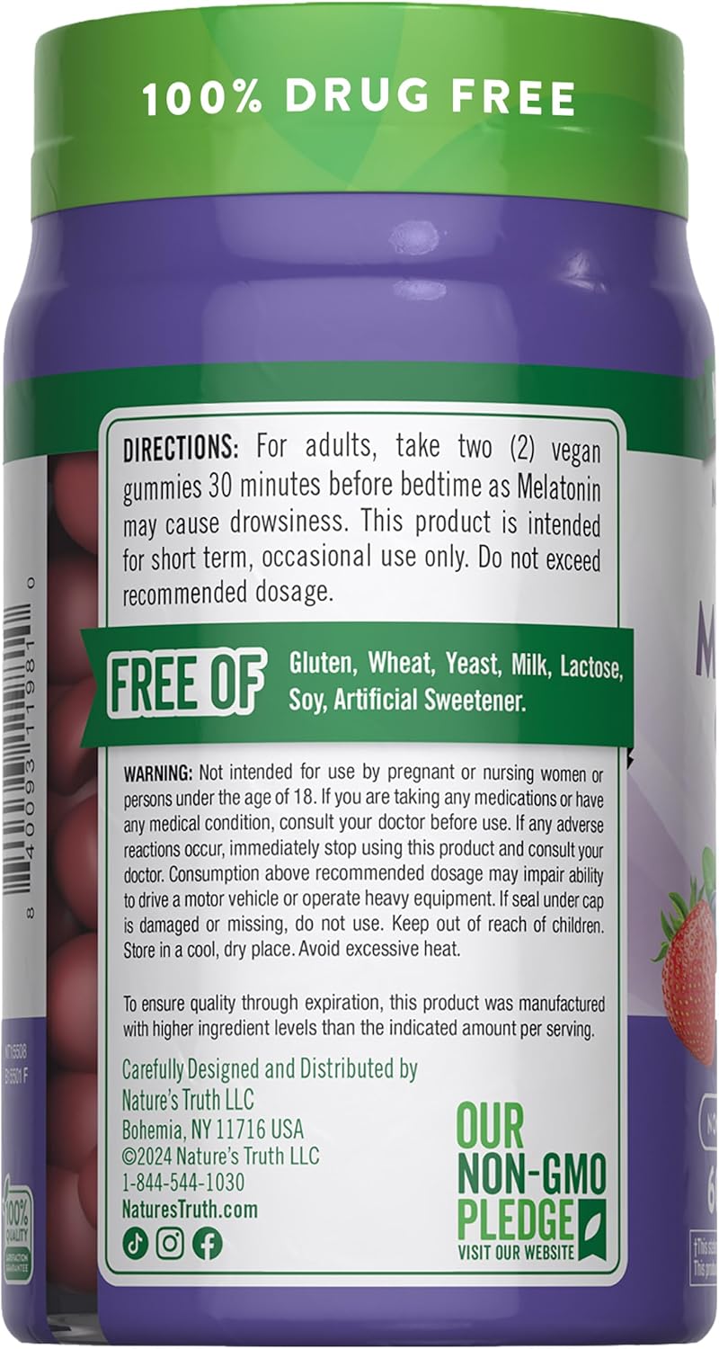 Nature's Truth - Melatonin 12mg Gummies არის არის მაღალი ხარისხის ბუნებრივი მელატონინის შემცველი ჟელეები, რომლებიც შექმნილია ძილის მხარდაჭერისთვის. მელატონინი წარმოადგენს ბუნებრივ ჰორმონს, რომელიც ორგანიზმში ხელს უწყობს ძილის ციკლის რეგულაციას და ძილის დაწყების პროცესს. თანამედროვე ცხოვრების სტრესი, ტექნოლოგიური მოწყობილობების ხშირად გამოყენება და ხშირი რეჟიმის დარღვევა ხშირად იწვევს ძილის პრობლემებს. სწორედ ამიტომ, Nature's Truth გთავაზობთ ეფექტურ და მარტივ გზას - გემრიელი ჟელეს ფორმით.