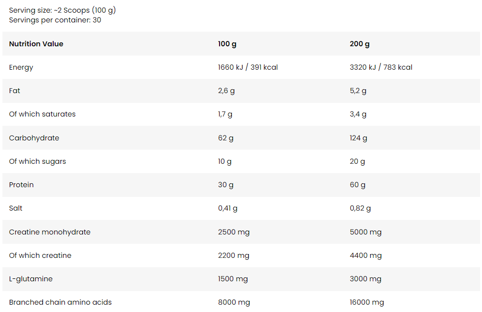 მასის მოსამატებელი გეინერის ფხვნილი რომელიც გამდიდრებულია კრეატინით და L-გლუტამინით. განკუთვნილია მოზრდილებისთვის, რომლებიც ასრულებენ მაღალი ინტენსივობის ვარჯიშებს. პროდუქტში შემავალი კრეატინი, პროტეინი და ნახშირწყლები დაგეხმარებათ მშრალი კუნთის და წონის პროპორციულ ზრდაში სწრაფი და ეფექტური შედეგისთვის.