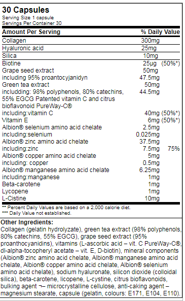 იგი შეიცავს კოლაგენსა და ჰიალურონის მჟავას, რომლებიც უზრუნველყოფენ კანის სიჯანსაღისა და ელასტიურობის შენარჩუნებას. პროდუქტი ასევე შეიცავს ყურძნის თესლისა და მწვანე ჩაის ექსტრაქტებს, რომლებიც ხელს უწყობენ კანის დაცვას თავისუფალი რადიკალებისგან. გარდა ამისა, პროდუქტი გამდიდრებულია ვიტამინებით და მინერალებით, როგორიცაა თუთია და სელენი, რომლებიც აძლიერებენ თმისა და ფრჩხილების სტრუქტურას.