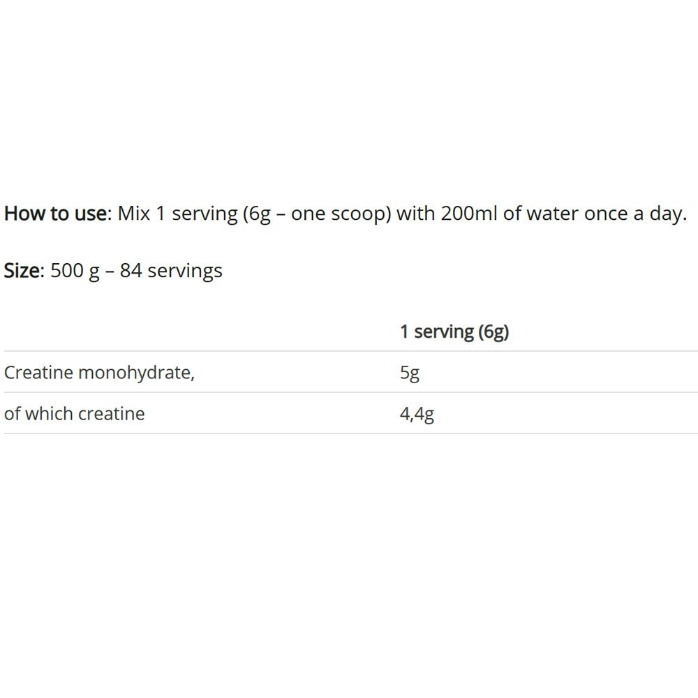 არასავარჯიშო დღეებში მიიღეთ 1 პორცია დღის პირველ ნახევარში. კრეატინის გამოყენების პერიოდში მიიღეთ დიდი რაოდენობით წყალი (მინიმუმ 3 ლიტრი დღეში).