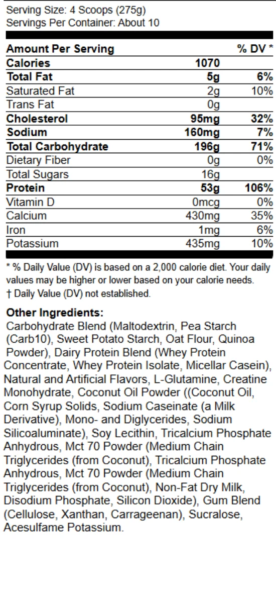 RAW Nutrition - CBUM Mass Gainer არის პრემიუმ ხარისხის კომპლექსური საკვები დანამატი, რომელიც შექმნილია სპორტსმენებისთვის და ფიტნესის მოყვარულთათვის, რომლებიც ცდილობენ მაქსიმალურად გაზარდონ მშრალი კუნთოვანი მასა და მიიღონ უსწრაფესი აღდგენა ვარჯიშის შემდეგ. ამ დანამატში გაერთიანებულია ყველა საჭრო კომპონენტი, რაც დაგეხამრებათ თქვენი მიზნის სწრაფად მიღწევაში.