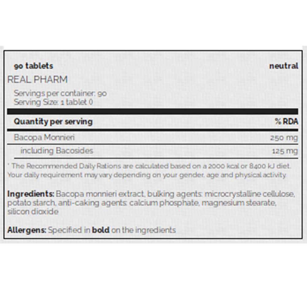 Real Pharm - Bacopa არის საკვები დანამატი, რომლის რეგულარული გამოყენება ხელს უწყობს ტვინის გამართულ მუშაობას, მეხსიერებისა და კონცენტრაციის გაუმჯობესებას. ასევე ამცირებს დაძაბულობასა და სტრესს, რაც განაპირობებს განწყობის გაუმჯობესებას.