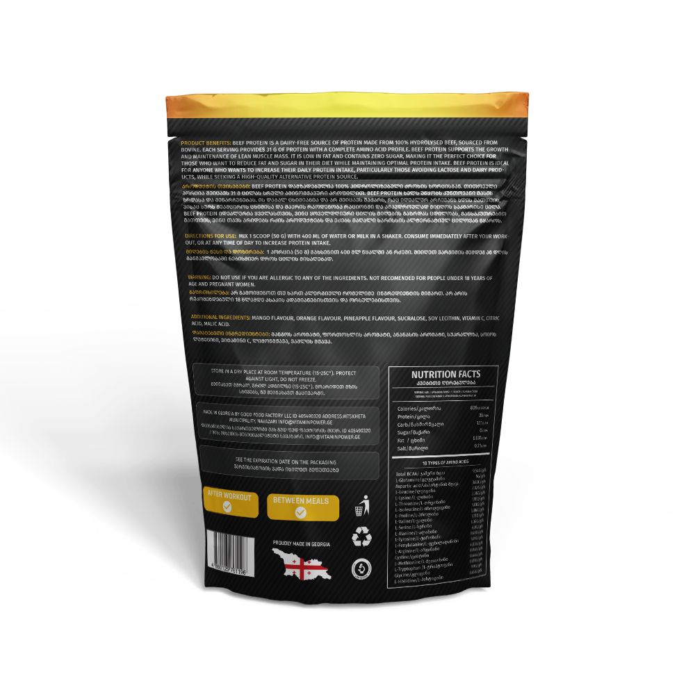 Vitamin Power Beef Protein არის თანამედროვე სპორტული კვების პროდუქტი, რომელიც დამზადებულია ჰიდროლიზებული საქონლის ცილის ბაზაზე. ეს ფორმულა იდეალურია მათთვის, ვინც ეძებს ალტერნატიულ ცილოვან წყაროს რძისპროდუქტებზე დაფუძნებული პროტეინის გარეშე. პროდუქტი სწრაფად და ეფექტურად შეითვისება ორგანიზმში, რაც უზრუნველყოფს კუნთოვანი ქსოვილისთვის აუცილებელი მშენებლობითი ელემენტების მიწოდებას.