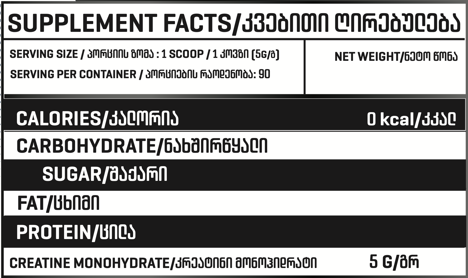 გახსენით 1 პორცია (1 კოვზი – 5გ) 200 მლ წყალში და მიიღეთ ვარჯიშის წინ, ან შემდეგ. არასავარჯიშო დღეებში მიიღეთ დილით, უზმოზე. კრეატინის გამოყენების პერიოდში მიიღეთ დიდი რაოდენობით წყალი (მინიმუმ 3 ლიტრი დღეში).